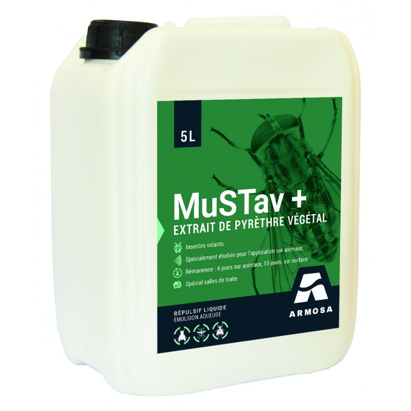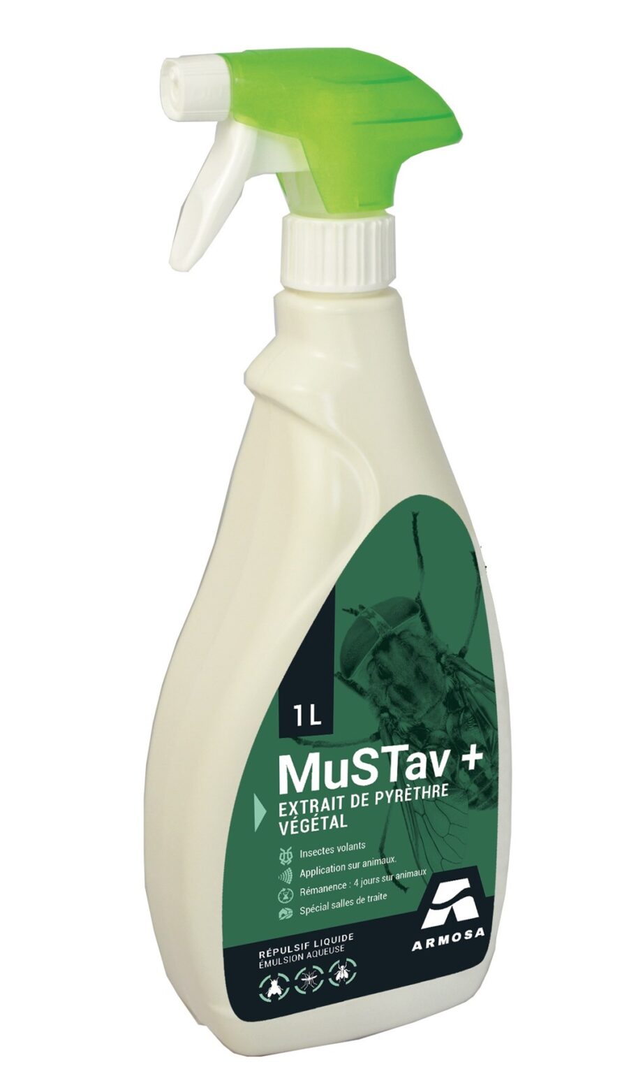 La solution MuSTav+ est un insectifuge prêt à l’emploi conçu pour les salles de traite. Il utilise un extrait naturel de pyrèthre végétal compatible agriculture biologique pour repousser efficacement mouches, moustiques et taons.